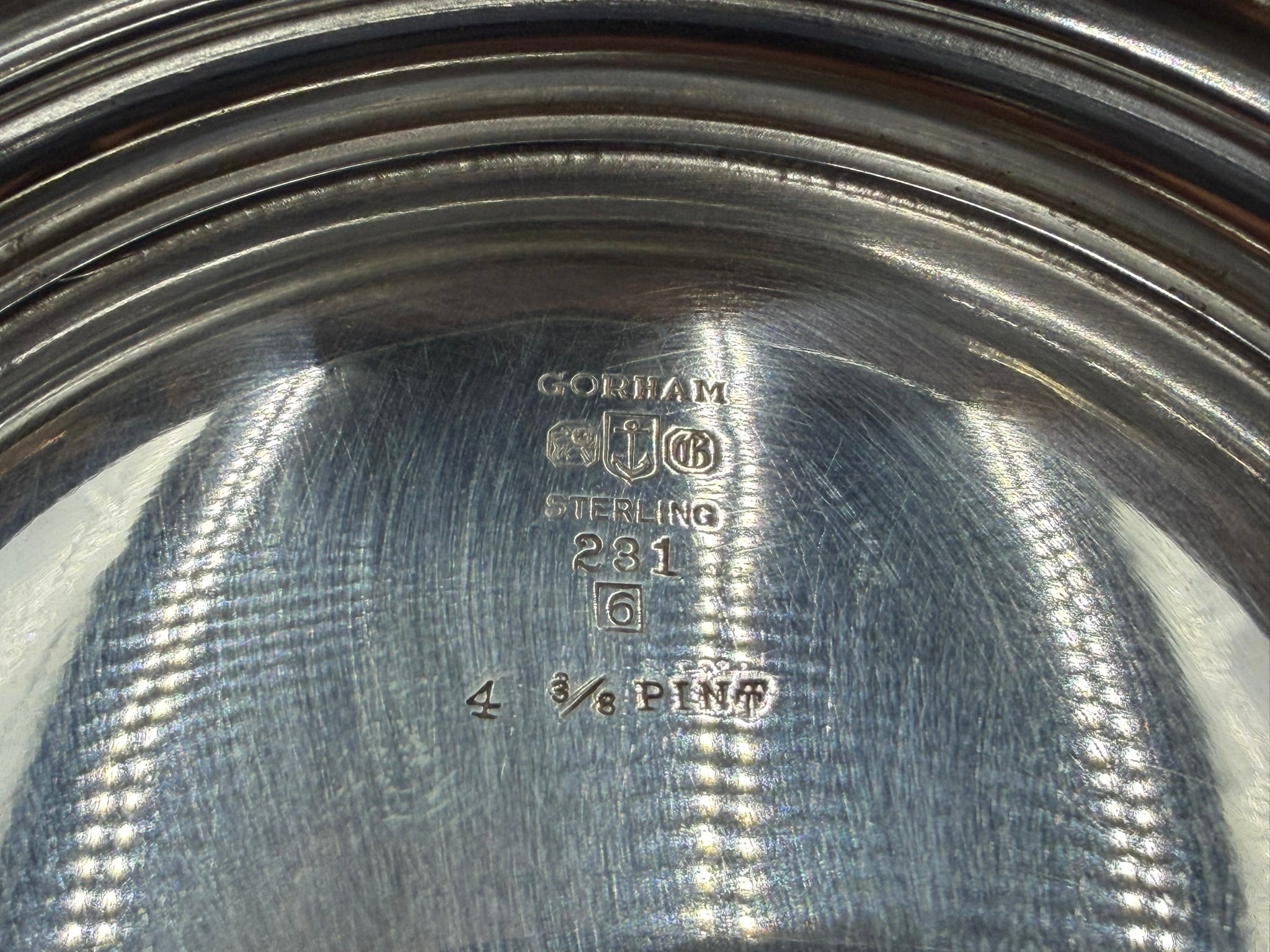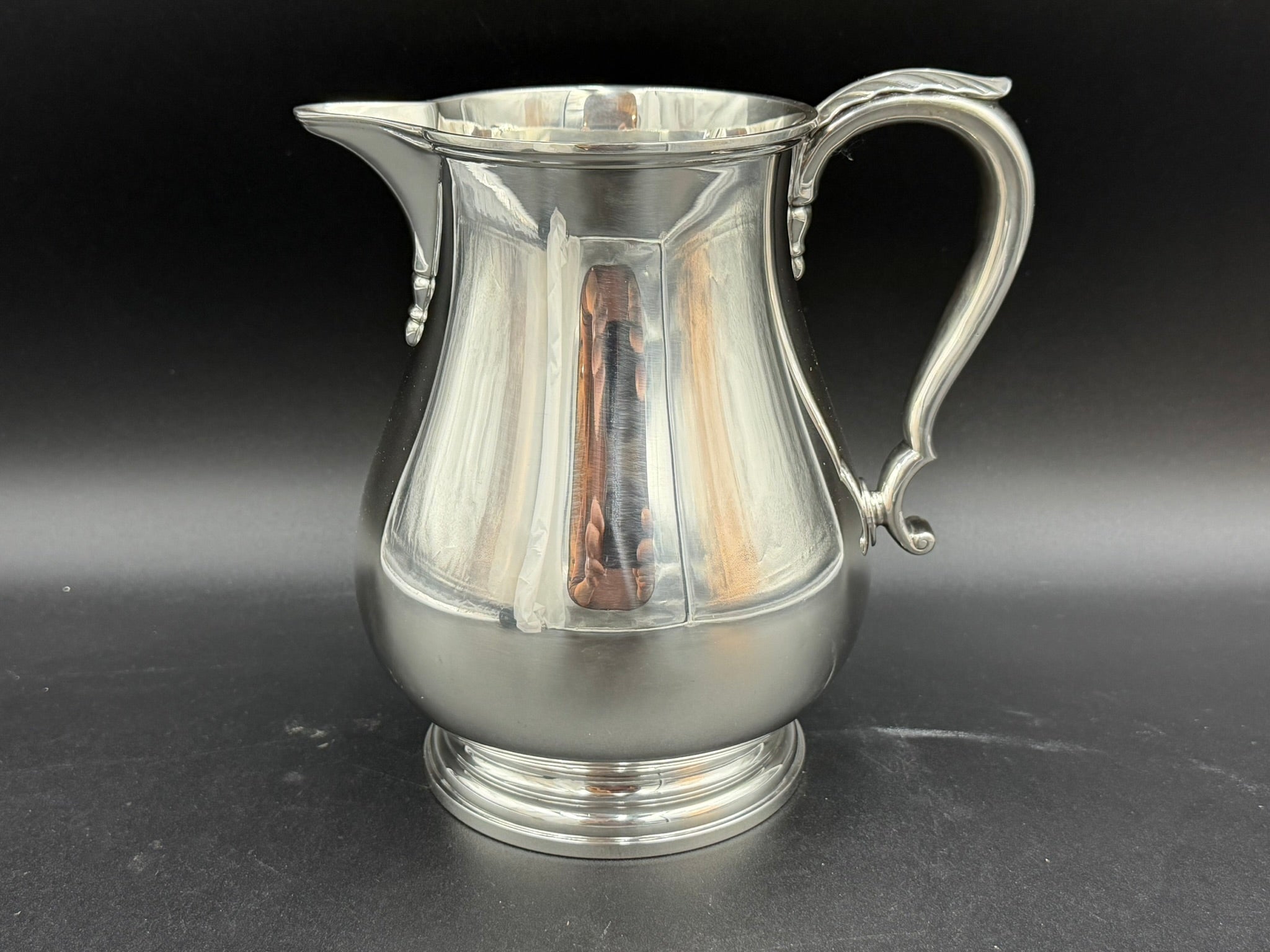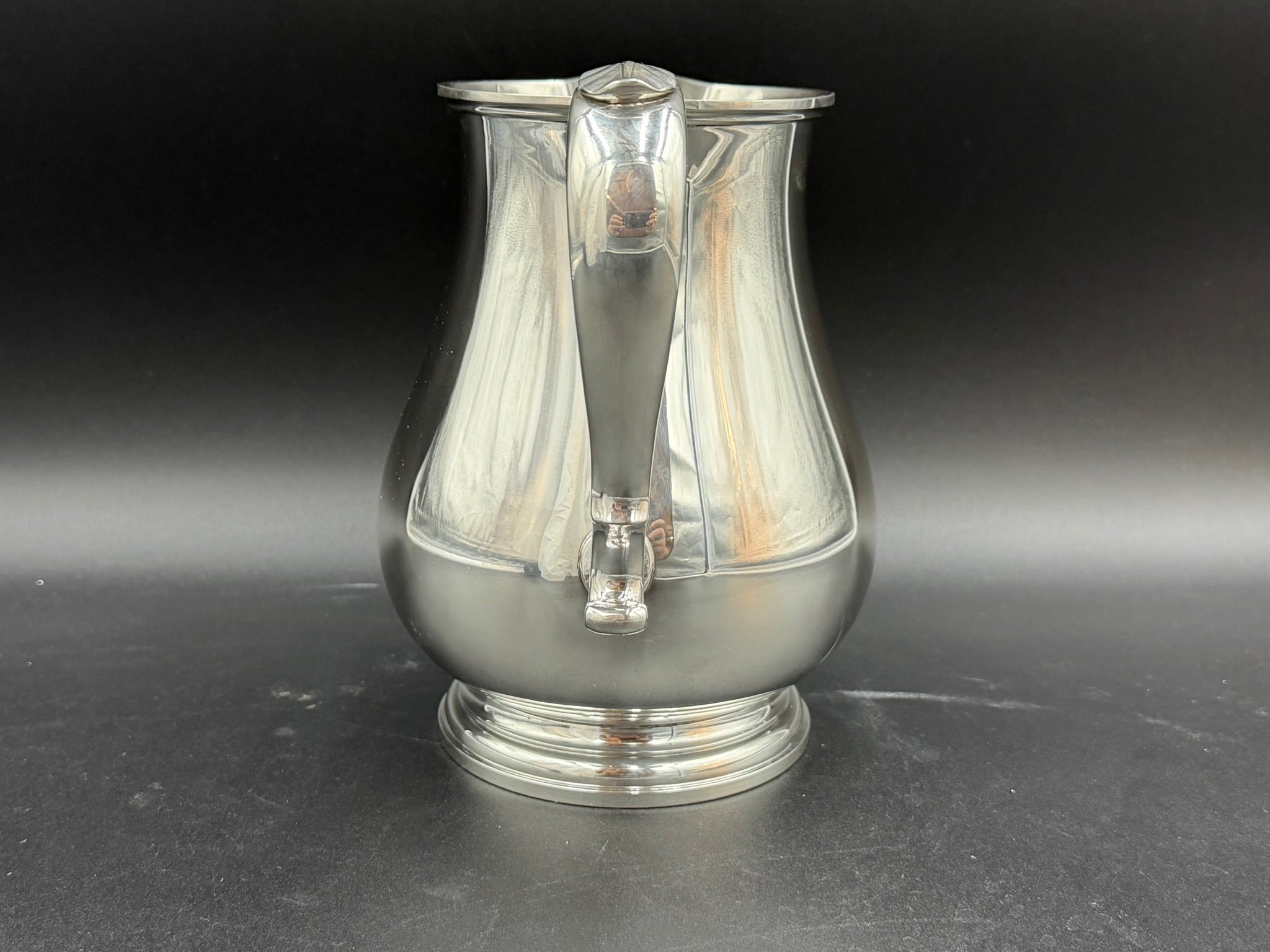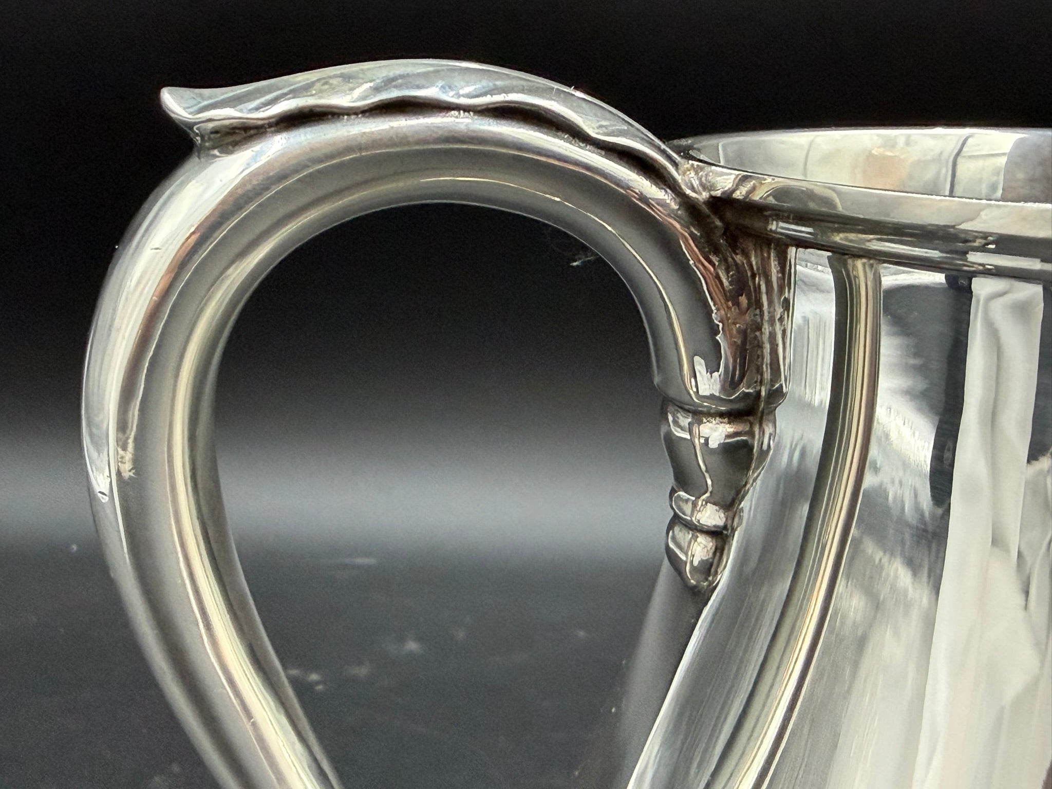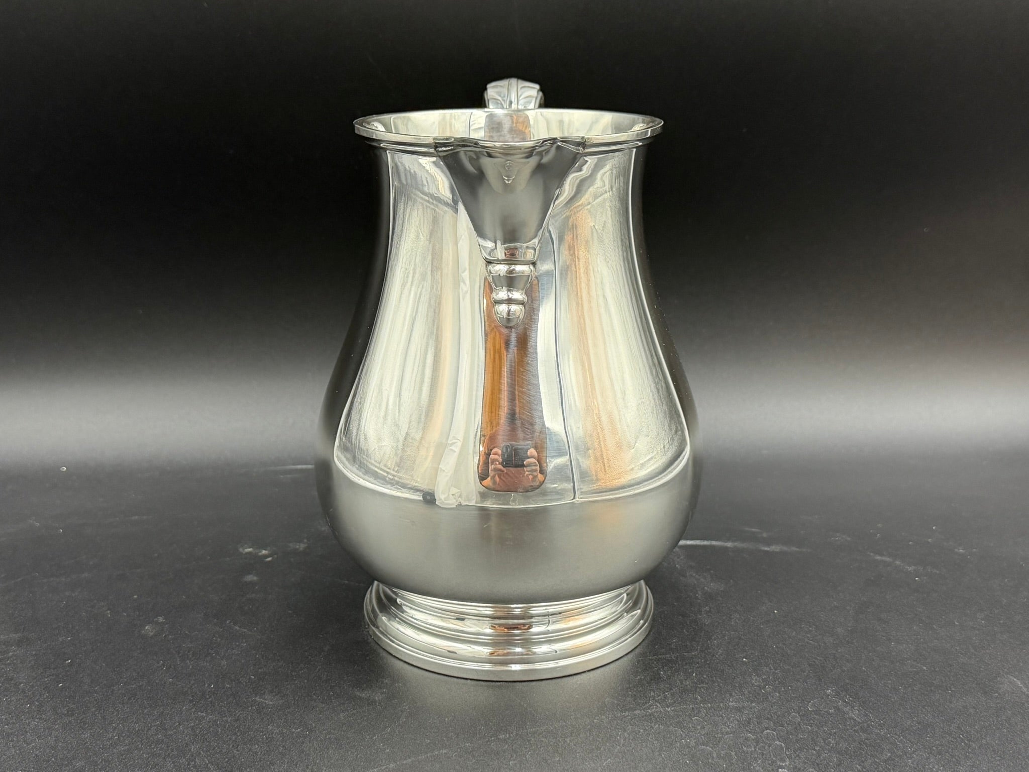 A Sterling Silver Water Pitcher with an Acanthus Leaf Handle by Gorham circa 1945. The Vintage Pitcher stands 8 inches tall to the tip of the handle and weighs 28.1 troy ounces. There is no monogram or removal and the bottom is clearly hallmarked.